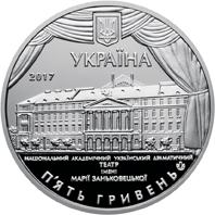 | На аверсі монети розміщено: угорі на тлі театральної куліси - малий Державний Герб України, під яким написи: УКРАЇНА та рік карбування монети 2017 (ліворуч); у центрі на дзеркальному тлі - будівля театру, під якою написи: НАЦІОНАЛЬНИЙ АКАДЕМІЧНИЙ УКРАЇНСЬКИЙ ДРАМАТИЧНИЙ/ ТЕАТР/ ІМЕНІ/ МАРІЇ ЗАНЬКОВЕЦЬКОЇ та номінал П`ЯТЬ ГРИВЕНЬ (унизу півколом); праворуч - логотип Банкнотно-монетного двору Національного банку України. |
