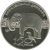 На реверсі монети розміщено: у центрі на тлі стилізованого зображення міста Харкова - слона, який тримає хоботом квітку, та написи: ХАРКІВСЬКИЙ ЗООПАРК (угорі півколом), 120/років (унизу). |