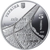 | На аверсі монети розміщено: угорі малий Державний Герб України, ліворуч півколом напис - УКРАЇНА, праворуч - номінал 5 ГРИВЕНЬ (вертикальний напис) та рік карбування монети 2017; стилізовану композицію: на бруківці розміщена трамвайна колія, спрямована вгору як символ руху до прогресу, та написи: КИЇВ 1892/PARIS 1881/BERLIN 1881/LONDON 1901; логотип Банкнотно-монетного двору Національного банку України (унизу ліворуч). |