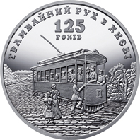 На реверсі монети зображено трамвай з пасажирами на тлі київського пейзажу та угорі півколом розміщено написи ТРАМВАЙНИЙ РУХ В КИЄВІ/125/РОКІВ. |