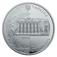 | На аверсі монети, що вертикально розділений навпіл на матову та дзеркальну поверхні, розміщено: угорі - малий Державний Герб України, праворуч півколом напис - УКРАЇНА, у центрі - будівлю Верховної Ради України, яка ліворуч обрамлена рослинним орнаментом, під будівлею - рік карбування монети 2016; унизу півколом номінал 5 ГРИВЕНЬ. |