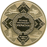 На реверсі монети розміщено стилізований вінок із плодів та листя калини, у центрі якого напис: 20 РОКІВ/ НЕЗАЛЕЖНОСТІ/УКРАЇНИ, по колу - стилізовані орнаментальні ромби, між якими зображено літак, комбайн, судно та шахту, що символізують відповідні галузі народного господарства, унизу під колом напис: 24 серпня/ 1991 р. На реверсі монети номіналом 5 гривень зображено стилізований вінок із плодів та листя калини, у центрі якого напис: 20 РОКІВ/ НЕЗАЛЕЖНОСТІ/ УКРАЇНИ/ 24 серпня/ 1991 р. |