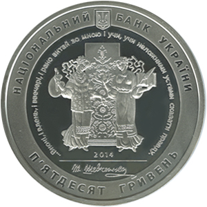 | На аверсі монети угорі розміщено: малий Державний Герб України та напис півколом НАЦІОНАЛЬНИЙ БАНК УКРАЇНИ, у центрі - у колі з рядків вірша `Муза` ...ВНОЧІ, І ВДЕНЬ, І ВВЕЧЕРІ, І РАНО ВИТАЙ ЗО МНОЮ І УЧИ, УЧИ НЕЛОЖНИМИ УСТАМИ СКАЗАТИ ПРАВДУ на тлі рушника зображено стилізоване алегоричне уособлення таланту митця - дві музи - Поезії та Образотворчого мистецтва, унизу написи: рік карбування монети 2014, факсиміле Т. Г. Шевченка , півколом номінал - П`ЯТДЕСЯТ ГРИВЕНЬ. |