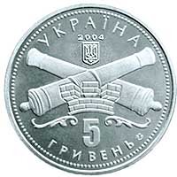 | На аверсі зображено дві перехрещені гармати, над якими розміщено малий Державний Герб України, рік карбування монети 2004 та написи півколом: УКРАЇНА (угорі) 5/ ГРИВЕНЬ (унизу), а також логотип Монетного двору Національного банку України. |