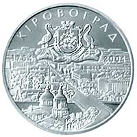 На реверсі монети зображено панораму міста, на тлі якої розміщено дати – 1754 - 2004, герб міста та угорі півколом напис КІРОВОГРАД. |