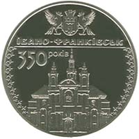 На реверсі монети зображено одну з найдавніших архітектурних споруд міста - костел Пресвятої Діви Марії, угорі - герб міста, під яким написи: ІВАНО-ФРАНКІВСЬК/ 350 РОКІВ. |
