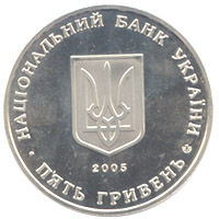 | На аверсі монети розміщено: у центрі малий Державний Герб України, під яким рік карбування монети - 2005 та кругові написи: НАЦІОНАЛЬНИЙ БАНК УКРАЇНИ ПЯТЬ ГРИВЕНЬ (унизу), а також логотип Монетного двору Національного банку України. |