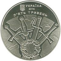| На аверсі монети розміщено: угорі малий Державний Герб України, праворуч від якого напис УКРАЇНА, під яким рік карбування монети 2014 та номінал - П`ЯТЬ ГРИВЕНЬ, у центрі - композиція з чотирьох мечів, що символізує військову співдружність чотирьох народів: польського, литовського, білоруського, українського. Місце перетину мечів увінчує стилізований вінок із дубового листя - символ військової слави і звитяги. Праворуч на монеті розміщено логотип Монетного двору Національного банку України. |
