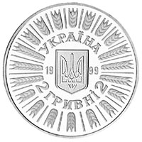 | На аверсі монети в обрамленні пшеничного колосся зображено малий Державний Герб України та розміщено написи: УКРАЇНА, 1999, 2 ГРИВНІ 2. |