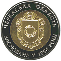 На реверсі монети зображено герб області, по колу розміщено написи: ЧЕРКАСЬКА ОБЛАСТЬ (угорі), ЗАСНОВАНА У 1954 РОЦІ (унизу). |