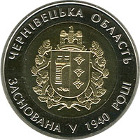 На реверсі монети зображено герб області, по колу розміщено написи: ЧЕРНІВЕЦЬКА ОБЛАСТЬ (угорі), ЗАСНОВАНА У 1940 РОЦІ (унизу). |