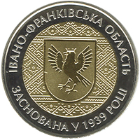 На реверсі монети зображено герб області, по колу розміщено написи: ІВАНО-ФРАНКІВСЬКА ОБЛАСТЬ (угорі), ЗАСНОВАНА У 1939 РОЦІ (унизу). |