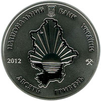 | На аверсі монети розміщено: малий Державний Герб України, написи півколом НАЦІОНАЛЬНИЙ БАНК УКРАЇНИ (угорі), ДЕСЯТЬ ГРИВЕНЬ (унизу); ліворуч рік карбування монети - 2012 та на тлі карти області зображено фрагмент прапора Донецької області. |