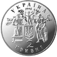 | На аверсі монети в центрі розміщено малий Державний герб України. Ліворуч і праворуч від герба зображені на повний зріст робітник із молотом біля ковадла та селянка із серпом і снопом; вони підтримують немовля - символ молодої держави на тлі крони дерева. Ця трьохфігурна композиція є адаптованим варіантом творів графіка Георгія Нарбута. Вгорі - напис в два рядки УКРАЇНА 1998; внизу - напис в два рядки 2 ГРИВНІ |