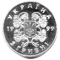 | На аверсі монети розміщені зображення малого Державного Герба України, орнаментований за мотивами народних настінних розписів і кругові написи УКРАЇНА, 2 ГРИВНІ, 1999 |