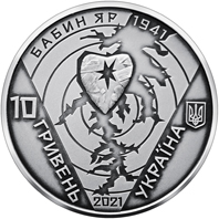 | На аверсі монети розміщено: малий Державний Герб України (праворуч), під яким вертикальний напис під кутом УКРАЇНА; ліворуч номінал – 10 ГРИВЕНЬ (вертикально під кутом); у центрі на тлі концентричних кіл, що нагадують мішень, та фрагмента топографічного зображення Бабиного Яру, що нагадує цівки крові, – стилізована композиція – пронизане кулею серце; написи: БАБИН ЯР 1941 (угорі півколом), рік карбування монети 2021 (унизу). |