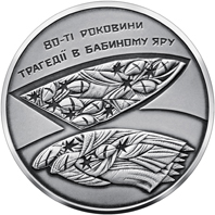 На реверсі монети зображено художньо-образну композицію, що відображає трагедію Бабиного Яру, – антропоморфні фігури, що нібито лежать під землею та уособлюють розстріляні сім’ї. Угорі розміщено напис: 80-ТІ РОКОВИНИ/ТРАГЕДІЇ В БАБИНОМУ ЯРУ. |