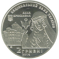 | На аверсі монети розміщено: угорі написи: НАЦІОНАЛЬНИЙ БАНК УКРАЇНИ (півколом), АННА/ЯРОСЛАВНА; ліворуч - малий Державний Герб України; у центрі - стилізований образ київської княжни Анни на тлі Софії Київської; унизу: номінал - 2/ГРИВНІ, рік карбування монети - 2014 та логотип Монетного двору Національного банку України (ліворуч). |