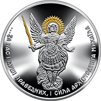 На реверсі монети на дзеркальному тлі зображено архістратига Михаїла (елемент оздоблення – локальна позолота); по колу розміщено напис: …ЗА НАС І ДУШІ ПРАВЕДНИХ, І СИЛА АРХІСТРАТИГА МИХАЇЛА (рядки з поеми Т. Г. Шевченка “Гайдамаки”) – використано шрифт “ChebanykSansN.2017 © VasylChebanyk”. |