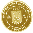 | На аверсі монети в намистовому колі розміщено малий Державний Герб України, над яким - рік карбування монети 2007; між намистовим колом і кантом монети - написи: НАЦІОНАЛЬНИЙ БАНК УКРАЇНИ (угорі), 2 ГРИВНІ (унизу), а також позначення металу, його проби - Au 999,9 (ліворуч), маса - 1,24 та логотип Монетного двору Національного банку України (праворуч). |