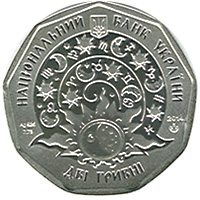 | На аверсі монети розміщено: угорі малий Державний Герб України, написи: угорі півколом - НАЦІОНАЛЬНИЙ БАНК УКРАЇНИ, унизу - номінал ДВІ ГРИВНІ та стилізовану композицію - на тлі зіркового неба зображення знаків зодіаку, місяця та сонця; рік карбування монети 2014 та логотип Монетного двору Національного банку України (праворуч), позначення металу, проби та маси Ag 925/7,78 (ліворуч). |