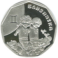 На реверсі монети зображено стилізовану композицію - ліворуч на матовому тлі символ знака зодіаку Близнюки, у центрі на траві - дівчинка та хлопчик близнюки, угорі напис - БЛИЗНЯТКА. |