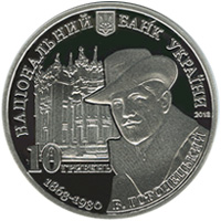 | На аверсі монети розміщено: угорі малий Державний Герб України, напис півколом НАЦІОНАЛЬНИЙ БАНК УКРАЇНИ, під яким (праворуч) рік карбування монети - 2013; на тлі будинку з химерами зображено портрет з написом півколом В. ГОРОДЕЦЬКИЙ, ліворуч від якого - роки життя архітектора 1863 - 1930, над якими номінал - 10 ГРИВЕНЬ. |