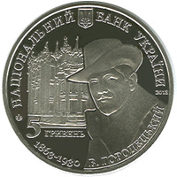 | На аверсі монети розміщено: угорі малий Державний Герб України, напис півколом НАЦІОНАЛЬНИЙ БАНК УКРАЇНИ, під яким (праворуч) рік карбування монети - 2013; на тлі будинку з химерами зображено портрет з написом півколом В. ГОРОДЕЦЬКИЙ, ліворуч від якого - роки життя архітектора 1863 - 1930, над якими номінал - 5 ГРИВЕНЬ та логотип Монетного двору Національного банку України. |