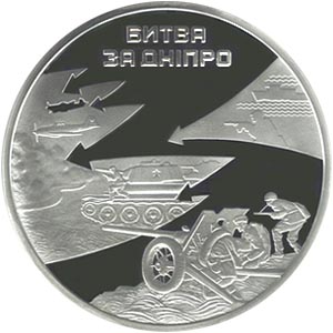 На реверсі монети розміщено стилізовану динамічну композицію із зображенням наступальної операції за участю різних родів військ - танкових, піхоти, артилерії, авіації, Дніпровської військової флотилії тощо, дзеркальна поверхня символізує Дніпро, угорі - напис БИТВА/ЗА ДНІПРО. |