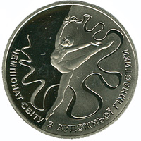 На реверсі монети зображено гімнастку зі стрічкою та напис півколом ЧЕМПІОНАТ СВІТУ З ХУДОЖНЬОЇ ГІМНАСТИКИ. |