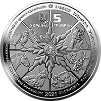 | На аверсі монети розміщено: малий Державний Герб України (угорі), написи: УКРАЇНА (під гербом); номінал монети – 5/ ГРИВЕНЬ (праворуч від герба); у центрі – символічне колесо життя, що знаменує відродження природи: стилізований міжнародний знак “Радіаційна загроза”, оповитий листям, навколо якого тварини, популяції яких розвиваються у 30-кілометровій зоні відчуження, що стала своєрідним резерватом для розмноження зокрема лелеки чорного, коня Пржевальського, рисі, зубра, лося, ведмедя бурого; по колу, на дзеркальному тлі написи: ЧОРНОБИЛЬСЬКИЙ РАДІАЦІЙНО-ЕКОЛОГІЧНИЙ БІОСФЕРНИЙ ЗАПОВІДНИК (ліворуч), CHORNOBYL RADIATION AND ECOLOGICAL BIOSPHERE RESERVE; рік карбування – 2021 (унизу); логотип Банкнотно-монетного двору Національного банку України (угорі). |