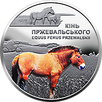 На реверсі монети на тлі пейзажу зображено коня Пржевальського (використано тамподрук), над яким на дзеркальному тлі написи: КІНЬ/ ПРЖЕВАЛЬСЬКОГО/ EQUUS FERUS PRZEWALSKII; угорі – коня та лоша. |