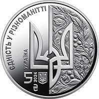 ЄДНІСТЬ У РІЗНОМАНІТТІ (угорі півколом) та напис УКРАЇНА (поруч із тризубом, вертикально). Унизу монети зазначено номінал 5 з графічним