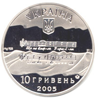 | На аверсі монети на тлі стилізованого Державного Прапора України розміщено перші нотні рядки Державного Гімну України `Ще не вмерла України і слава, і воля`, над яким - малий Державний Герб України, а також написи: УКРАЇНА (угорі півколом), 10 ГРИВЕНЬ/ 2005 (унизу) та позначення металу, його проби - Ag 925 і вага в чистоті - 31,1. На монеті розміщено логотип Монетного двору. |
