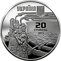 | На аверсі монети розміщено: угорі напис УКРАЇНА, праворуч від якого малий Державний Герб України; та композицію, що символізує яскравий, емоційний, багатий світ поезії Лесі Українки: ліворуч на дзеркальному тлі – стилізовані під свічі образи чоловіка та жінки; праворуч – ключ журавлів, над яким номінал та рік карбування монети 20/ГРИВЕНЬ/ 2021. |