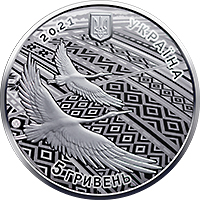 | На аверсі монети розміщено: композицію, що символізує Україну, – безкрайні мальовничі поля у вигляді стилізованих орнаментів, над якими летять лелеки – один із символів України, на тлі якої вгорі малий Державний Герб України, написи: УКРАЇНА (праворуч півколом), 2021 (ліворуч від герба), номінал монети – 5 ГРИВЕНЬ (унизу півколом); логотип Банкнотно-монетного двору Національного банку України (ліворуч). |