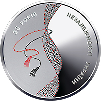 На реверсі монети зображено кольорову вишивану стрічку (використано тамподрук), що символізує код нації і нагадує ДНК, яка є матеріальним носієм генетичної інформації, тобто забезпечує збереження, передавання і відтворення інформації, та півколом розміщено написи: 30 РОКІВ (угорі ліворуч на матовому тлі) НЕЗАЛЕЖНОСТІ УКРАЇНИ (праворуч на дзеркальному тлі). |