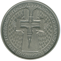 На реверсі монети на тлі запалених свічок зображено хрест з лелекою всередині та по колу розміщено написи: ГОЛОДОМОР - ГЕНОЦИД УКРАЇНСЬКОГО НАРОДУ, 1932 ПАМ`ЯТАЙМО! 1933. |