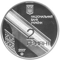 | На аверсі монети стилізовано зображено орнаментальну смугу та обріз книги, на тлі якого напис - 2/ГРИВНІ; угорі на дзеркальному тлі розміщено малий Державний Герб України, під яким напис - НАЦІОНАЛЬНИЙ/ БАНК/УКРАЇНИ, унизу ліворуч рік карбування монети - 2007 і логотип Монетного двору Національного банку України. |