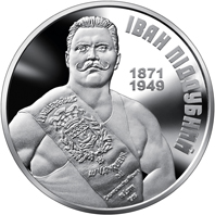 На реверсі монети на дзеркальному тлі зображено І. Піддубного, праворуч від якого – роки життя 1871/1949 та напис ІВАН ПІДДУБНИЙ (півколом праворуч). |