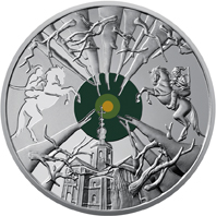 На реверсі монети розміщено композицію, що символізує реліктовий ліс: угорі і внизу, з ракурсу погляду людини вгору, зображено дерева, вершини яких тягнуться до жовто-зеленого кола (використано тамподрук) у центрі монети, що символізує листя та сонце; ліворуч і праворуч – коні з вершниками, які символізують визвольну боротьбу часів гайдамаччини та Холодноярської Республіки; унизу серед дерев ? Троїцька церква Мотронинського монастиря. |