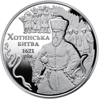 На реверсі монети на передньому плані зображено гетьмана Петра Сагайдачного, на другому – постаті воїнів; ліворуч на дзеркальному тлі розміщено написи: ХОТИНСЬКА/ БИТВА/ 1621/ РІК. |