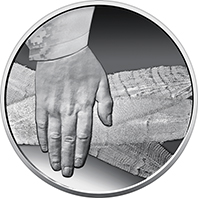 На реверсі монети в центрі композиції змодельовано смужки бинта, що перетинаються. Вони ніби ізолюють рану, накриту рукою медика, яка немов зцілює і тамує біль. Це символізує самовідданість та професіоналізм медичних працівників, які борються за життя людей у найскладніших обставинах. |