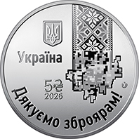 На аверсі монети зображено традиційний орнамент української вишивки, що переходить у "піксель". Таке поєднання відображає еволюцію української сили – від спадщини минулого до інновацій сьогодення. У верхній частині композиції ліворуч зазначено: малий Державний Герб України, напис УКРАЇНА, номінал 5 та графічний знак гривні, рік карбування монети – 2026. Праворуч розміщено логотип Банкнотно-монетного двору Національного банку України. Унизу монети – напис ДЯКУЄМО ЗБРОЯРАМ!.