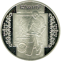 На реверсі монети на тлі натягнутої шкіри зображено кушніра за роботою. Угорі на стилізованому фоні розміщено напис КУШНІР, з обох боків центральної композиції - стилізований орнамент. |