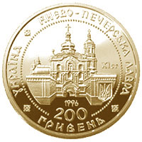 | На аверсі монети в центрі кола, утвореного намистовим узором, розміщено зображення Троїцької надбрамної церкви Лаврського ансамблю та фрагмент його головної дзвіниці. Праворуч зображено малий Державний герб України. Внизу по колу - позначення номіналу у два рядки 200 ГРИВЕНЬ, над ним 1996 - рік випуску. По колу монети написи: ліворуч УКРАЇНА, вгорі та праворуч КИЕВО-ПЕЧЕРСЬКА ЛАВРА. |