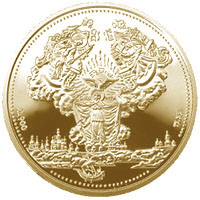 На реверсі монети у верхній частині композиції розміщені фрагменти розписів Троїцької надбрамної церкви: БОГ ОТЕЦЬ, БОГ СИН, БОГ ДУХ СВЯТИЙ з відповідними написами старослов`янським шрифтом. Під ними зображена Божа мати, покровителька запорізького козацтва. Всі образи розміщені на хмарах. Внизу композицію об`єднує панорама Лаври, в основу якої покладена гравюра роботи Л.Тарасевича з `Патерика Печорського` (1702 р.). Зображення замкнуте у коло, яке утворено намистовим узором. По боках зображення розміщені позначення і проба дорогоцінного металу Аu 900 та його вага у чистоті 15,55 |