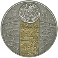 | На аверсі монети розміщено: ліворуч малий Державний Герб України, під яким напис УКРАЇНА; праворуч рік карбування монети 2015, номінал 20/ГРИВЕНЬ; у центрі зображено срібляник - одну з перших монет, які карбувалися в Київській державі, під ним - фрагмент древнього Києва (використано локальну позолоту), до розбудови якого Володимир Святославович доклав багато зусиль; праворуч і ліворуч стилізовану композицію - пагорби з назвами племен, які населяли цю територію. |