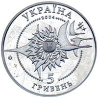 | На аверсі монети в центрі в намистовому колі зображено малий Державний Герб України в оточенні алегоричної композиції із сонця, стилізованого крила, птахів та зірок, що втілює мрію людства досягти космічних висот, та кругові написи - УКРАЇНА, 2004, 5, ГРИВЕНЬ. |