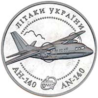 На реверсі монети зображено літак АН-140 та між зовнішнім кантом монети і намистовим колом розміщено кругові написи: угорі - ЛІТАКИ УКРАЇНИ; унизу - АН-140 та AN-140, між якими розміщено логотип `АН`. |